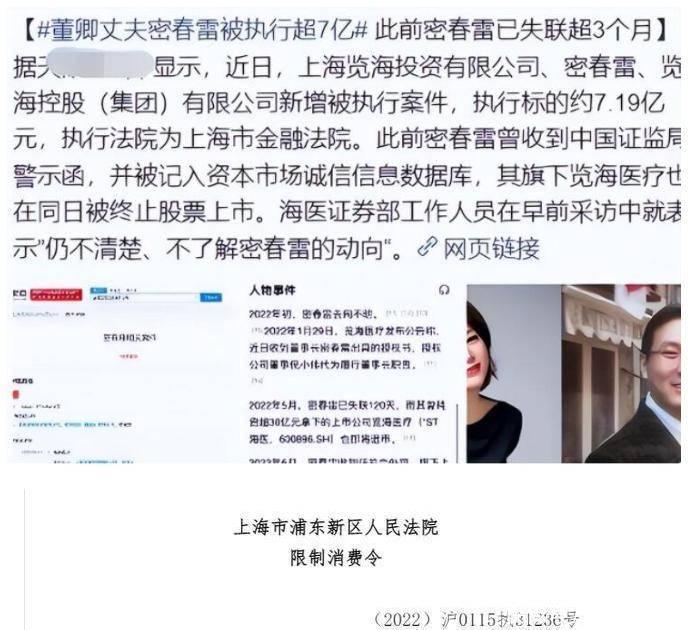 尽管这属于董卿的私人事务,但仍旧使她的公众形象遭受了较为显著的不利影响。儿子国籍问题引发的风波刚过去不久,丈夫密春雷又惹出乱子了。 2022年年初,有消息传出密春雷“失联”。同一年的11月,上海证券交易所对密春雷作出公开谴责的处理。